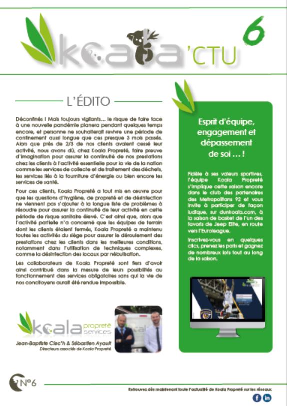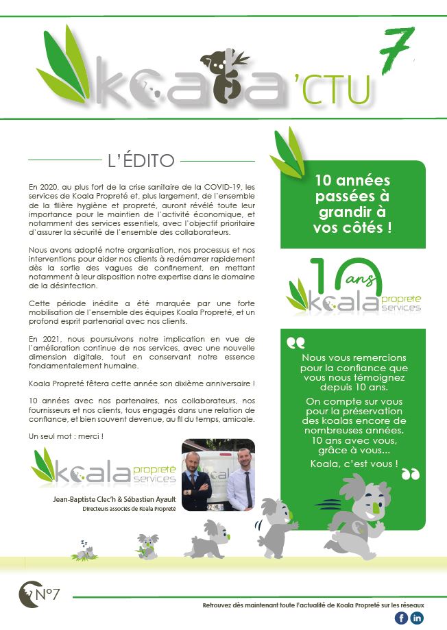 KOALA’CTU Mieux communiquer et vous tenir informés de nos évolutions et de l’actualité du monde du nettoyage, telle est la vocation de cette newsletter… votre newsletter ! KOALA'CTU N°1 Lire KOALA'CTU N°2 Lire KOALA'CTU N°3 Lire KOALA'CTU N°4 Lire KOALA'CTU N°5 Lire KOALA'CTU N°6 Lire KOALA'CTU N°7 Lire KOALA'CTU N°8 Lire